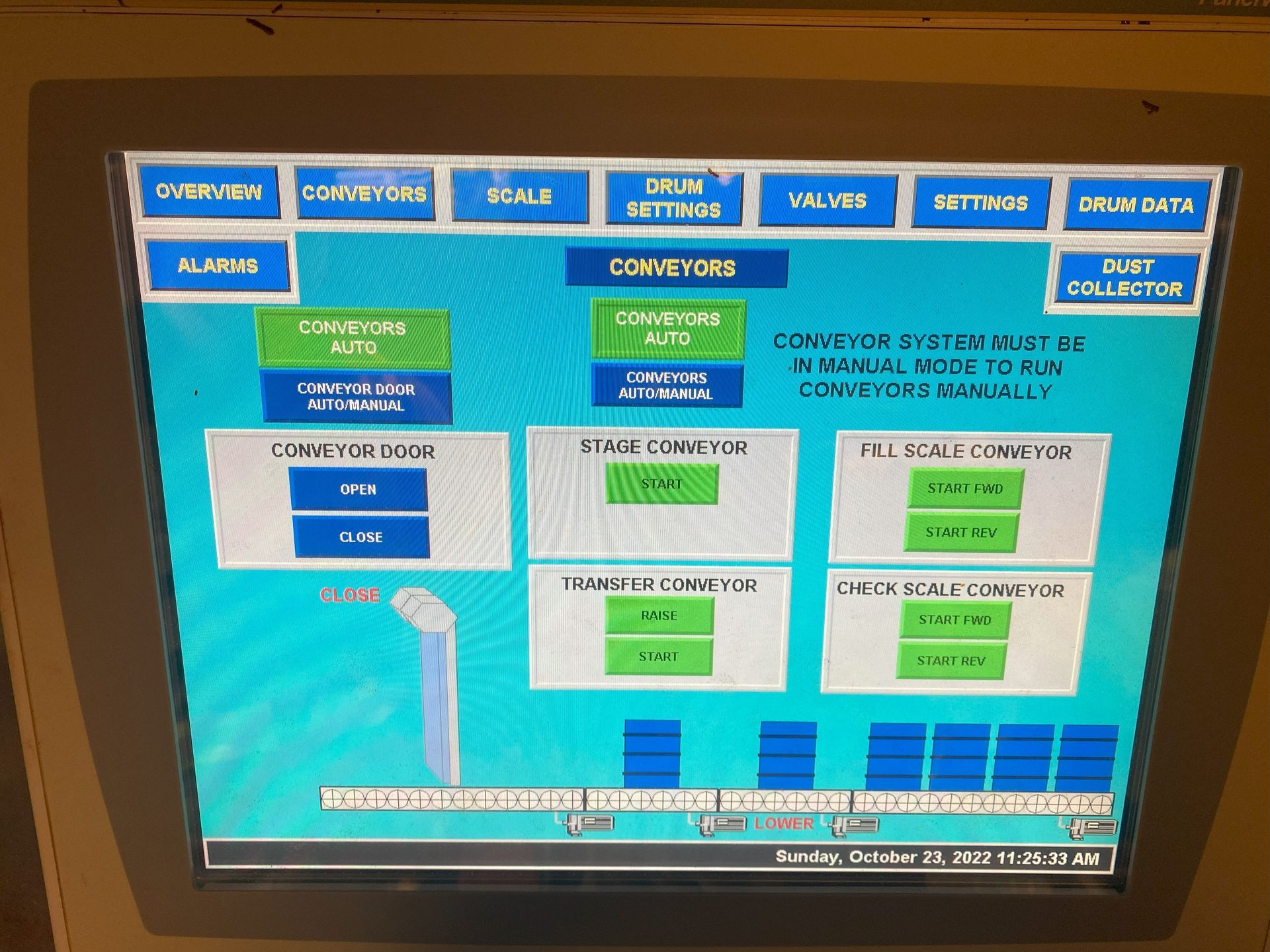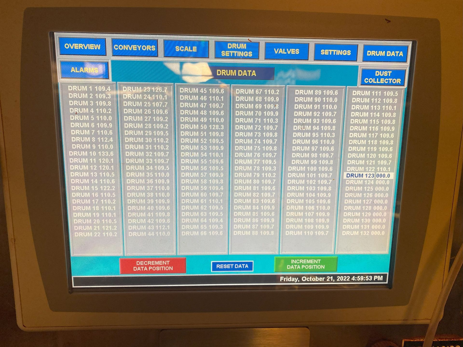 Matrix designed and supplied a custom drum filling system for pharmaceutical grade of corrosive and combustible dust in a Class II environment. A variable / fast closing gate was used for bulk and dribble fill of the drum. A check weigh station is below powered rollers beside the filling station where the liner is tied and the drum lid fastened. The drumming system is capable of filling different drum sizes as well as storing drumming campaign batch data for drum traceability. Automated roller conveyors were employed for handling empty and filled drums.