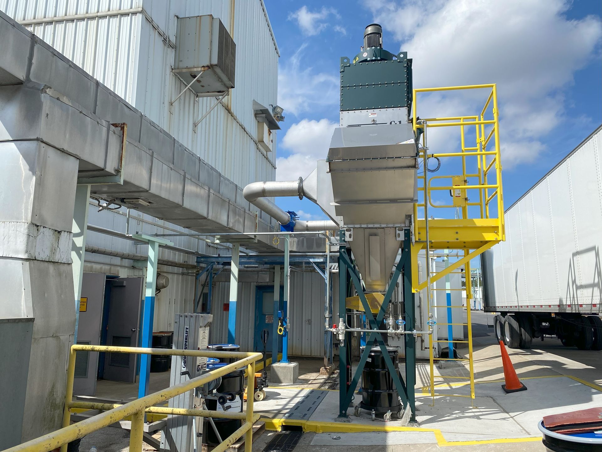 Our PLC based control system also utilized variable speed on the fan control for maintaining proper vacuum levels within the system, despite the differential pressure through the filter elements as well as interlocking the fan motor with the explosion/fire safety instrumentation.