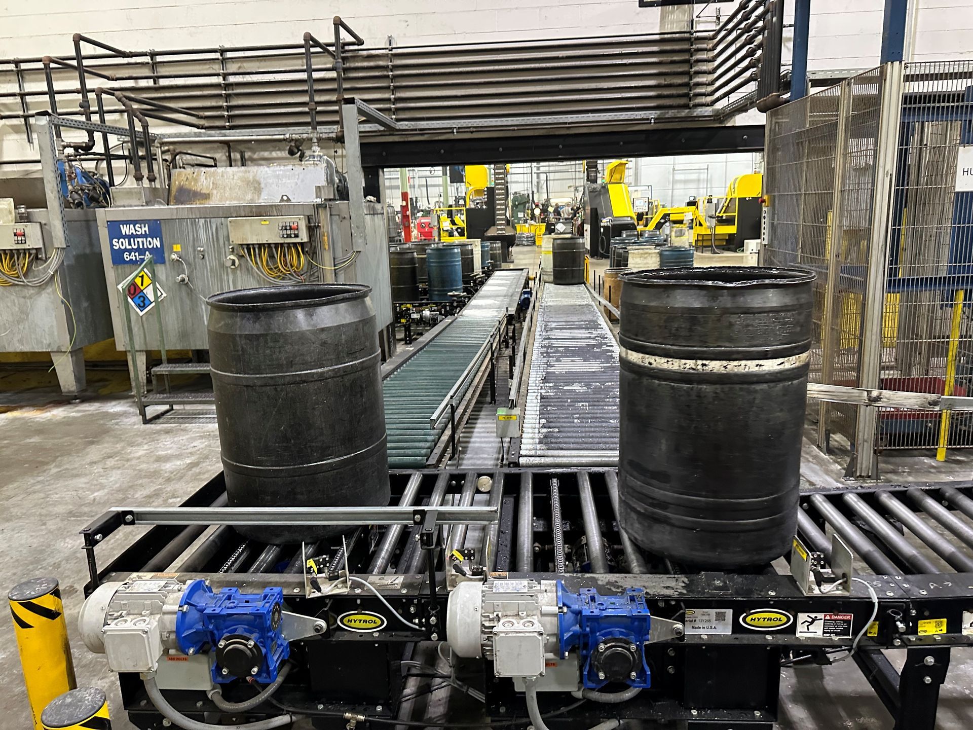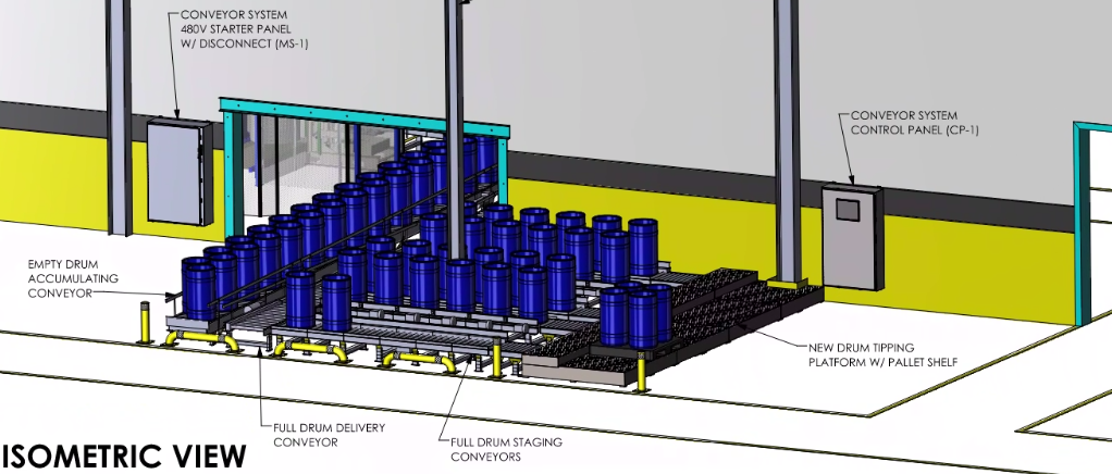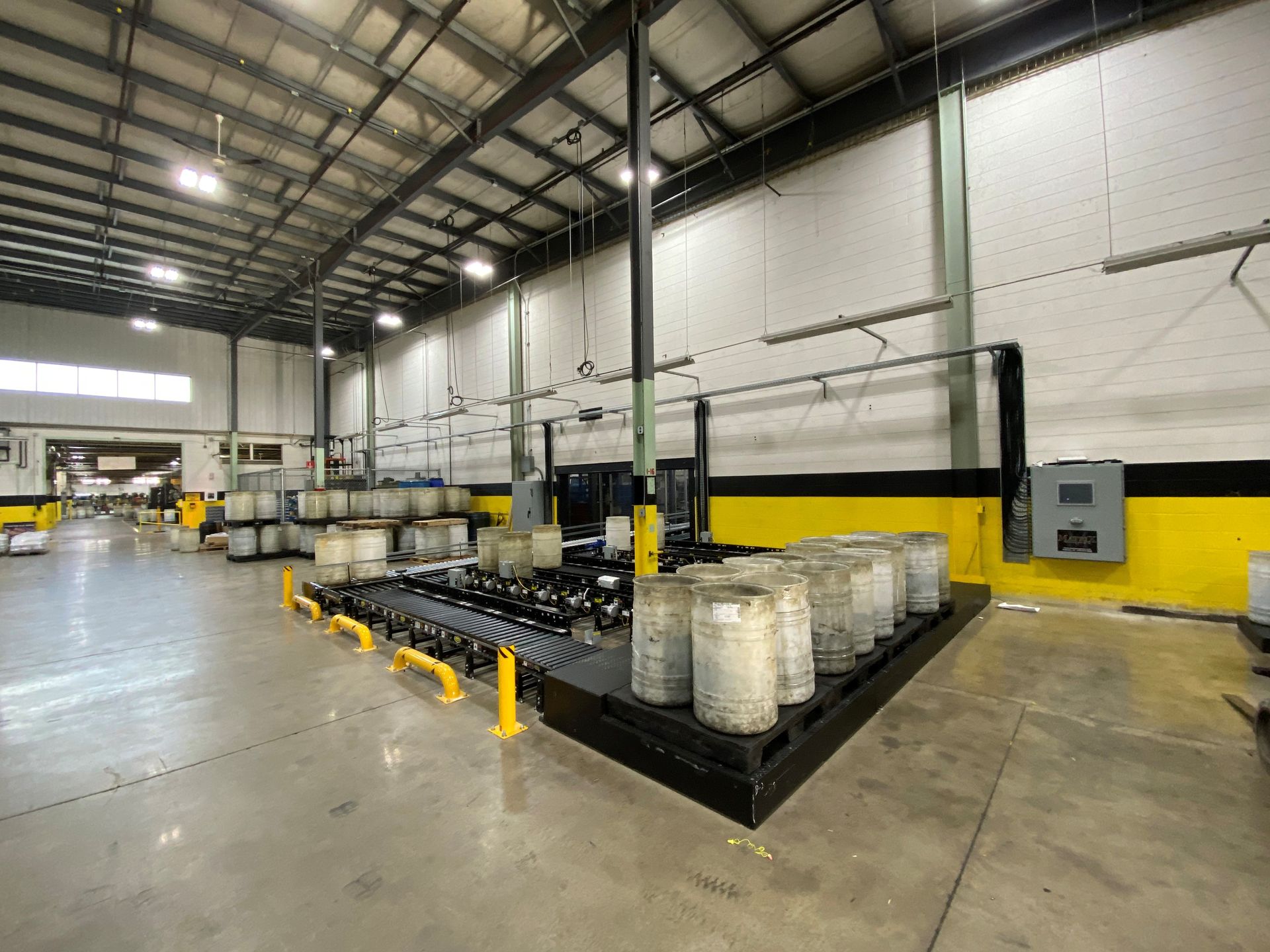 This process automated a formerly labor intensive process in which an operator was responsible for dumping and elevating each drum individually. With our system, the operator was able to efficiently load the indexing conveyors, quickly barcode scan them in place and walk away from the system and perform other duties.