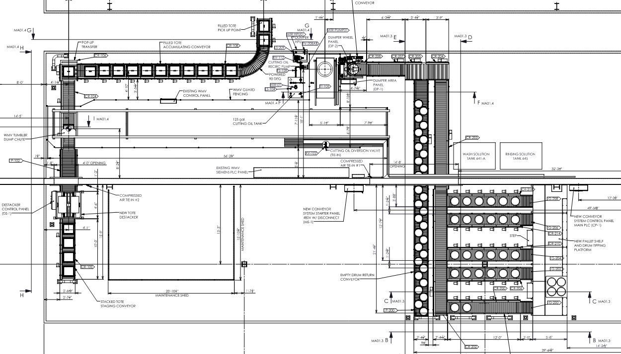 Matrix designed and supplied a drum based material handling system for transferring various metal parts/fasteners to a washing system. Our system also handled the washed parts after transferring them to smaller totes to be used in the downstream process. Our system was capable of staging 30 filled drums with a variety of different possible parts. Our filled drum infeed system utilized a PLC with wireless barcode scanning to track each batch of parts being washed and subsequently printed a barcode data sheet dropping it in each of the washed parts finished totes at the end of the system.