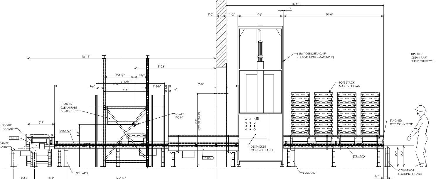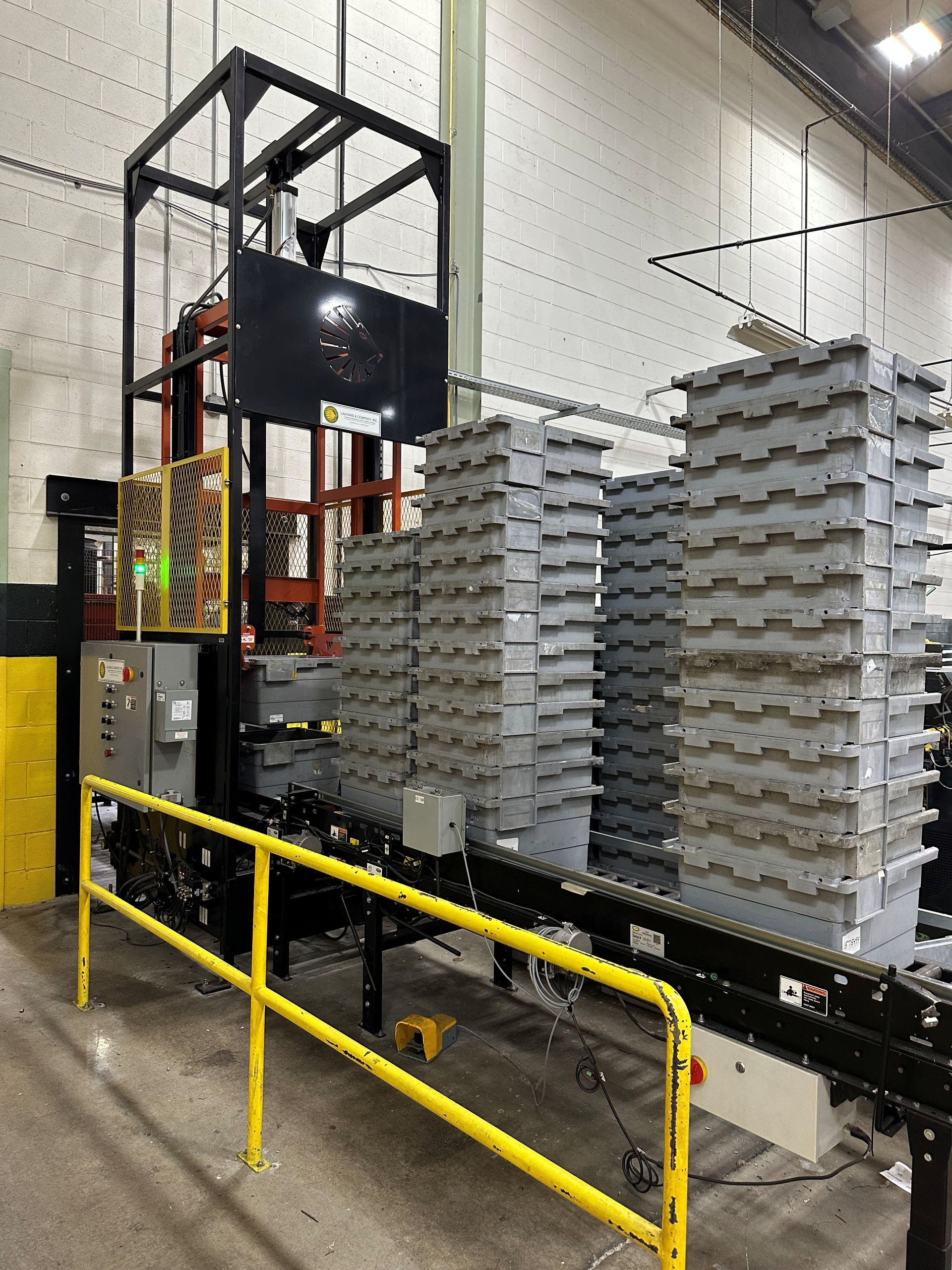 On the discharge side of the washing system, we utilized a "tote de-stacker" to store and index totes into the catch-out process. After the Totes where filled with clean parts, they went to automated indexing conveyors for ultimate removal with a fork truck.
