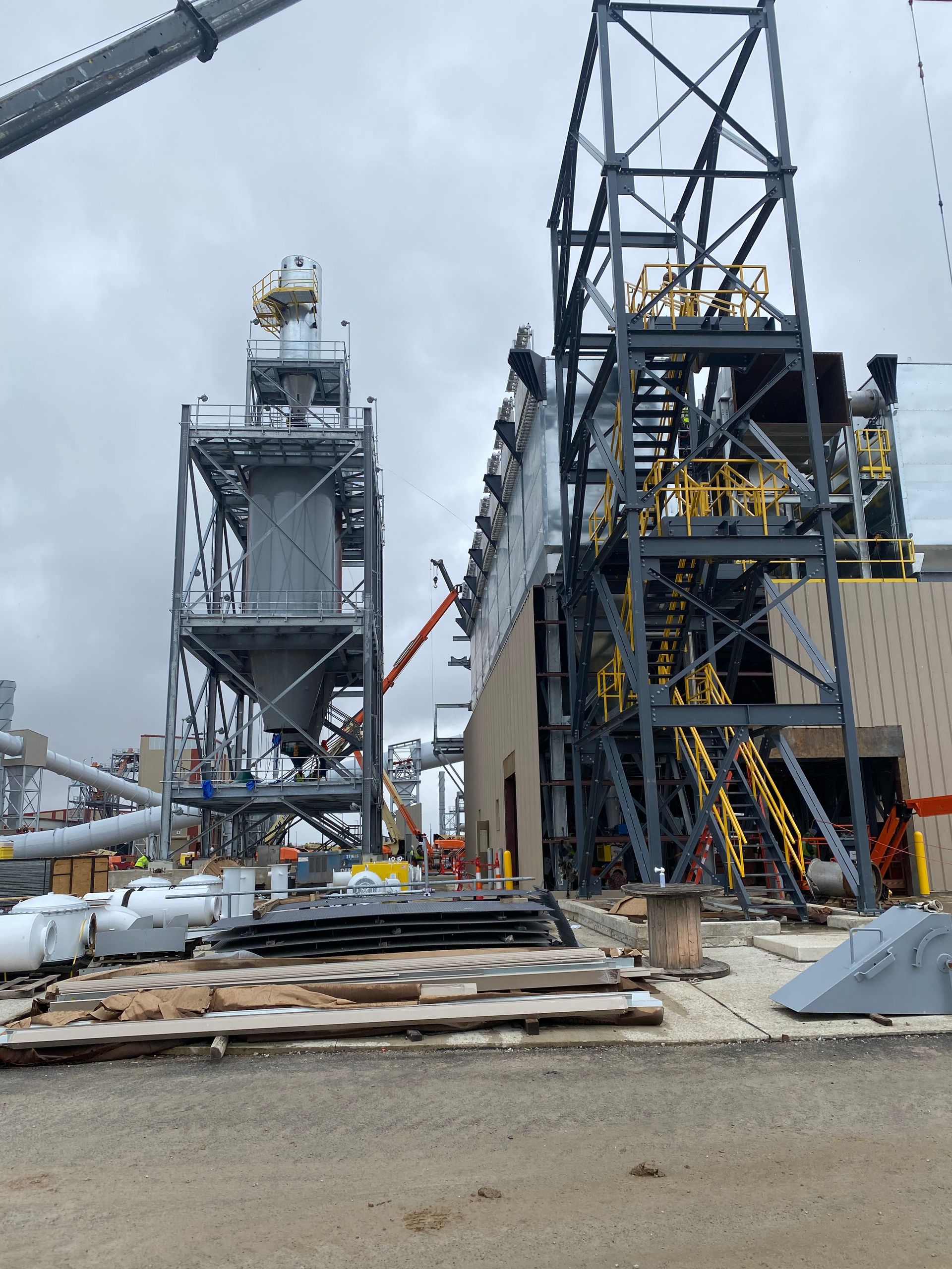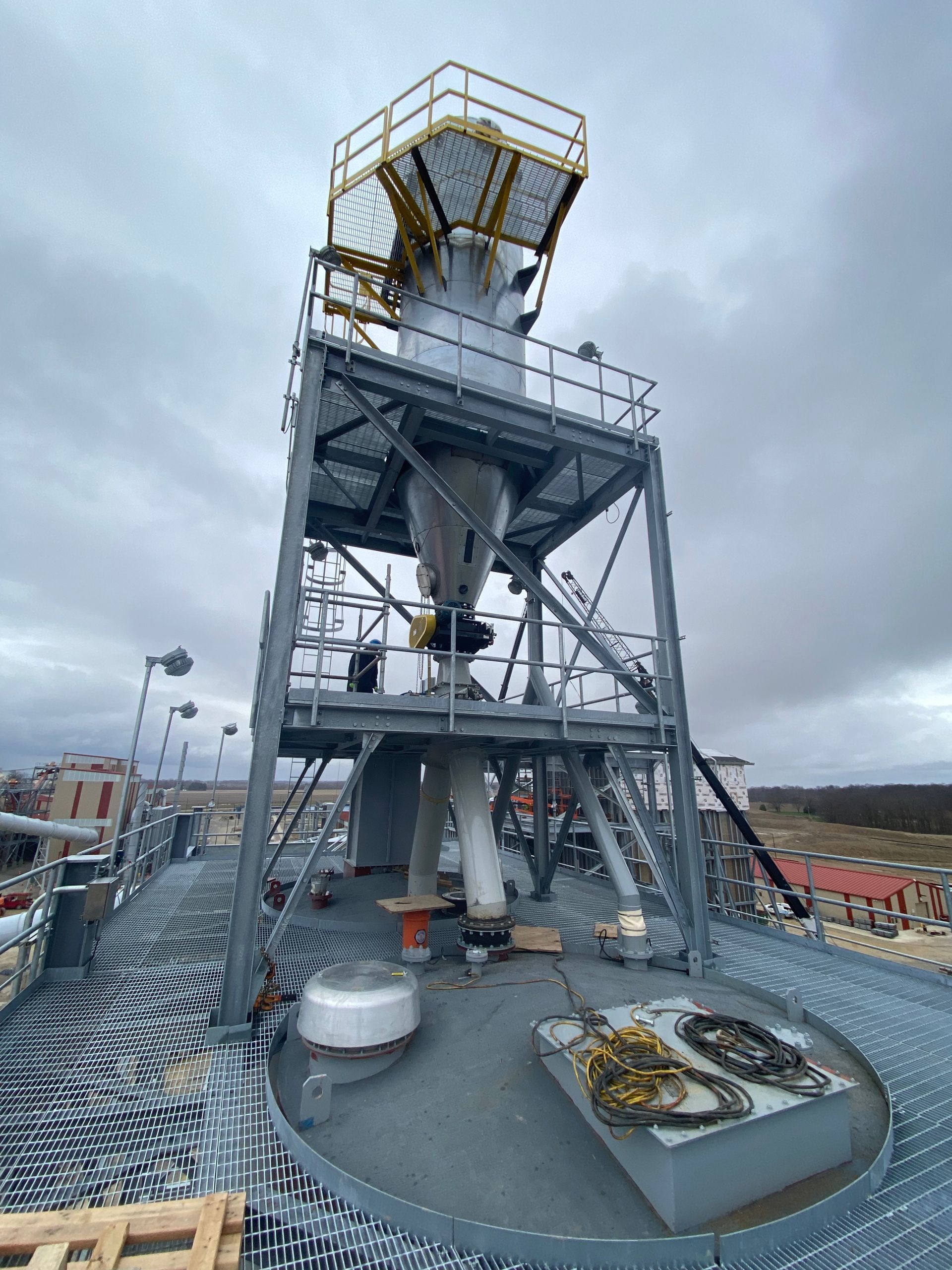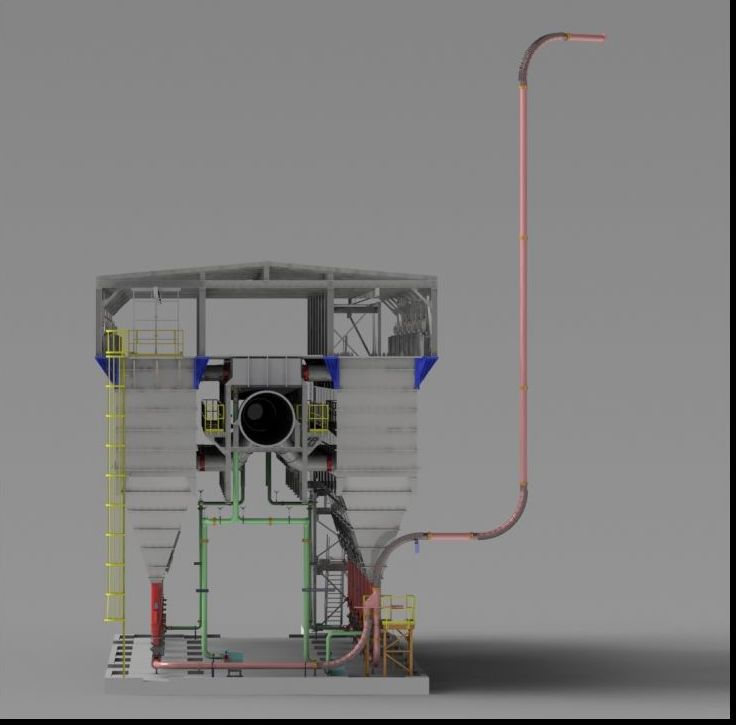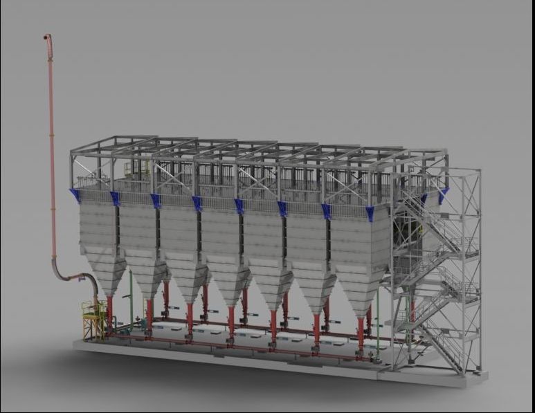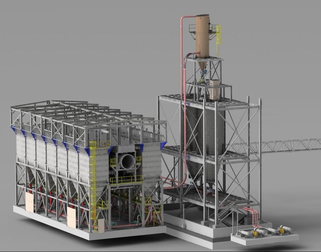 Matrix designed and specified equipment for a modular (14) Section Product Final Dust Collector and vacuum take-away system. A 150HP Vacuum Blower was deployed for pulling the hot and abrasive product through (2) 10" branch convey lines serving (7) modular DC sections each to a common converging switch and ultimately through a vacuum receiver/filter with the capability of dropping product to (2) 100MT Silos. Design rate for the system was 15 mtph. The system design rose to over 115ft above grade.